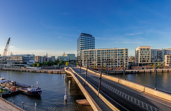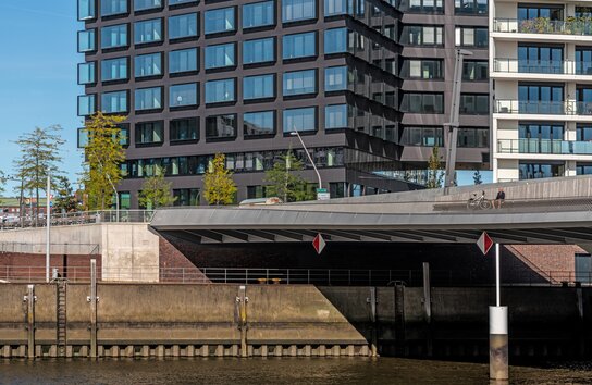 - Prominente Ecklage an der Baakenhafenbrücke.
