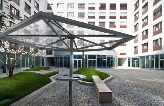 - Insgesamt fünf Erschließungskerne mit je 2 Aufzügen
